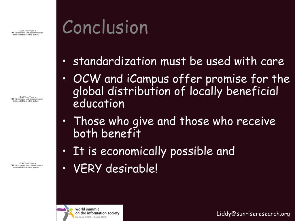 Conclusion • standardization must be used with care • OCW and iCampus offer promise for the global distribution of locally beneficial education • Those who give and those who receive both benefit • It is economically possible and • VERY desirable! Liddy@sunriseresearch.org