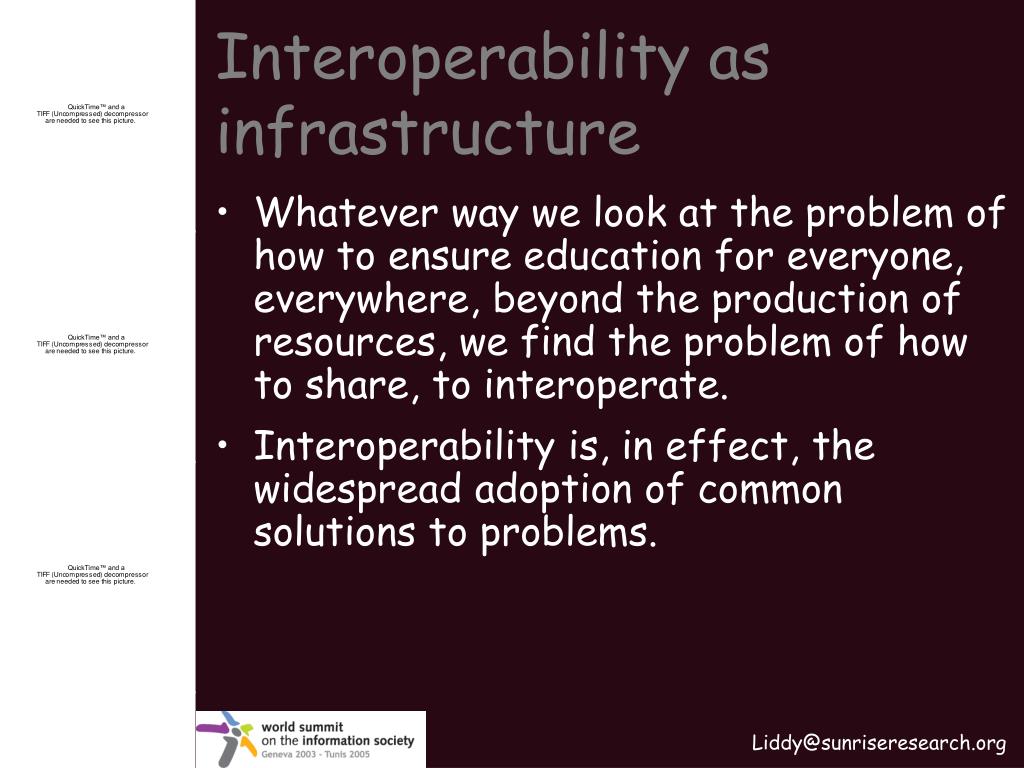 Interoperability as infrastructure • Whatever way we look at the problem of how to ensure education for everyone, everywhere, beyond the production of resources, we find the problem of how to share, to interoperate. • Interoperability is, in effect, the widespread adoption of common solutions to problems. Liddy@sunriseresearch.org