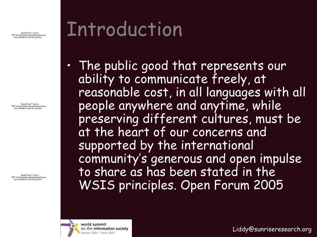 Introduction • The public good that represents our ability to communicate freely, at reasonable cost, in all languages with all people anywhere and anytime, while preserving different cultures, must be at the heart of our concerns and supported by the international community’s generous and open impulse to share as has been stated in the WSIS principles. Open Forum 2005 Liddy@sunriseresearch.org