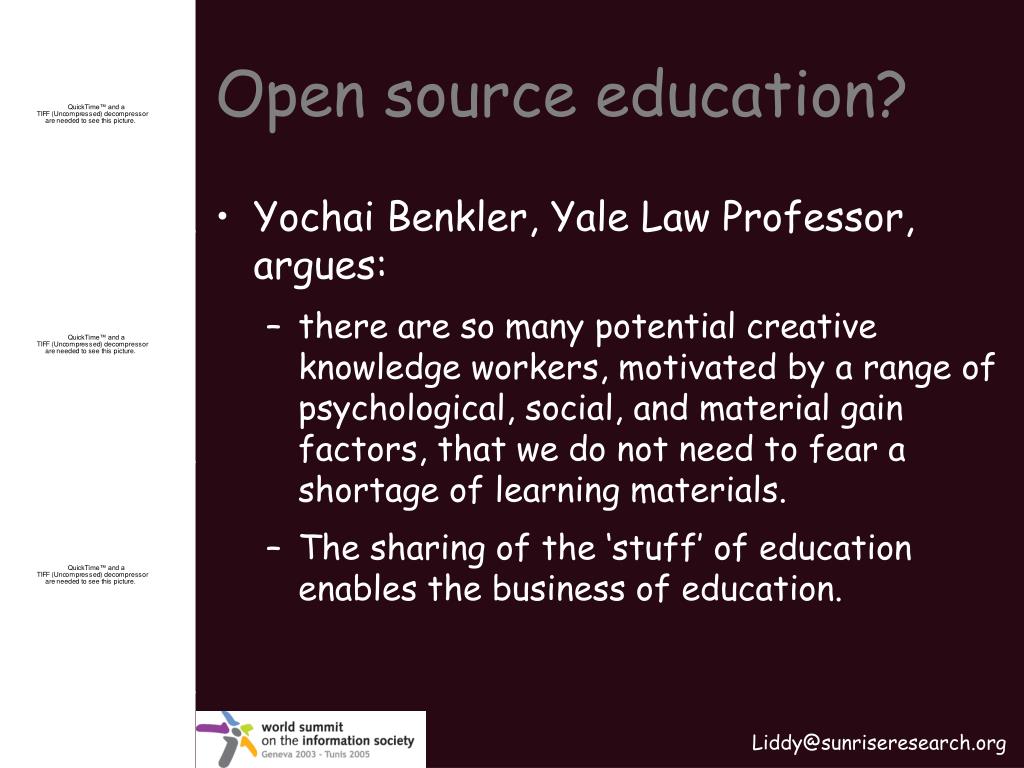 Open source education? • Yochai Benkler, Yale Law Professor, argues: • there are so many potential creative knowledge workers, motivated by a range of psychological, social, and material gain factors, that we do not need to fear a shortage of learning materials. • The sharing of the ‘stuff’ of education enables the business of education. Liddy@sunriseresearch.org