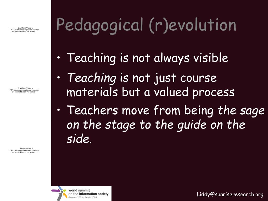 Pedagogical (r)evolution • Teaching is not always visible • Teaching is not just course materials but a valued process • Teachers move from being the sage on the stage to the guide on the side. Liddy@sunriseresearch.org