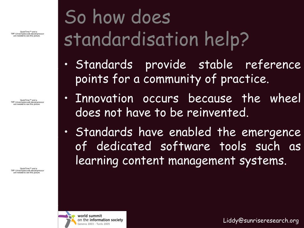 So how does standardisation help? • Standards provide stable reference points for a community of practice. • Innovation occurs because the wheel does not have to be reinvented. • Standards have enabled the emergence of dedicated software tools such as learning content management systems. Liddy@sunriseresearch.org