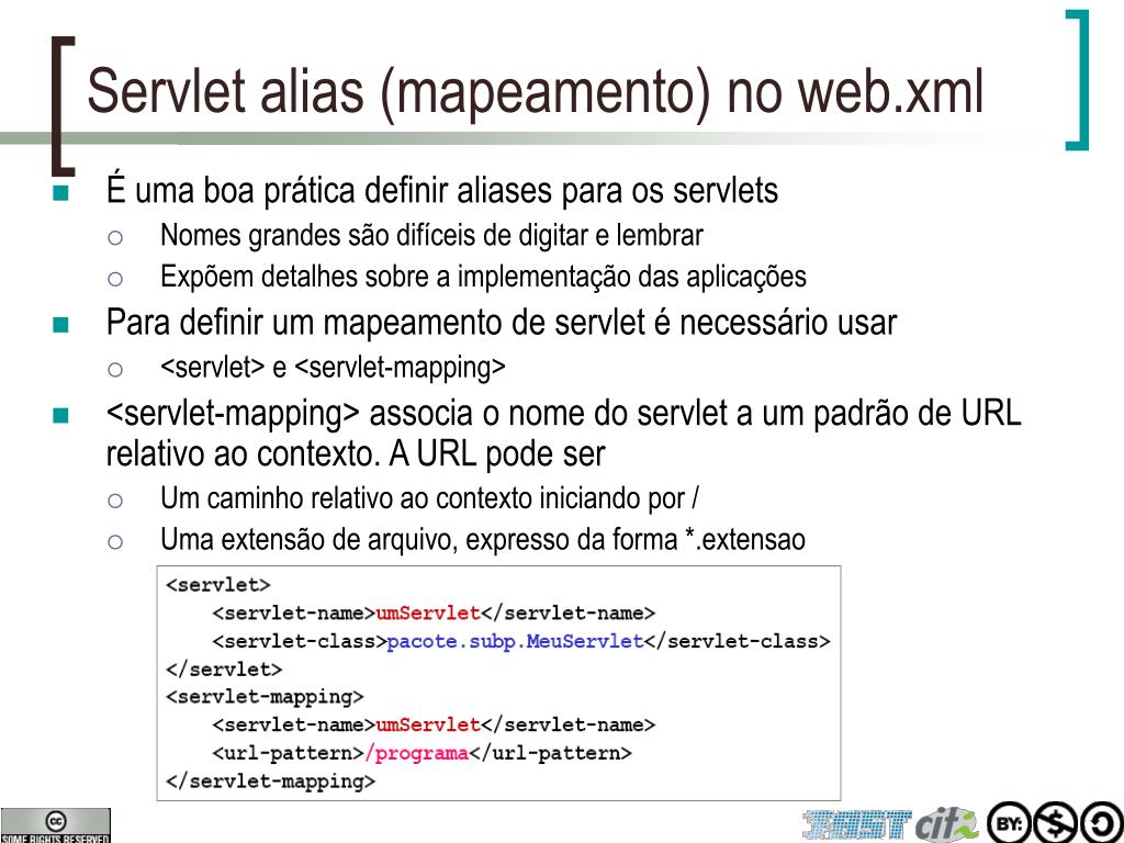 Servlet alias (mapeamento) no web.xml • É uma boa prática definir aliases para os servlets • Nomes grandes são difíceis de digitar e lembrar • Expõem detalhes sobre a implementação das aplicações • Para definir um mapeamento de servlet é necessário usar • <servlet> e <servlet-mapping> • <servlet-mapping> associa o nome do servlet a um padrão de URL relativo ao contexto. A URL pode ser • Um caminho relativo ao contexto iniciando por / • Uma extensão de arquivo, expresso da forma *.extensao