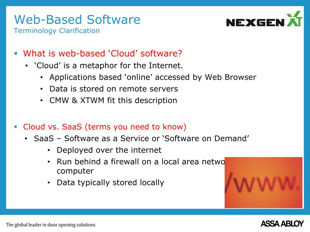 What is web-based ‘Cloud’ software? • ‘Cloud’ is a metaphor for the Internet. • Applications based ‘online’ accessed by Web Browser • Data is stored on remote servers • CMW & XTWM fit this description • Cloud vs. SaaS (terms you need to know) • SaaS – Software as a Service or ‘Software on Demand’ • Deployed over the internet • Run behind a firewall on a local area network or personal computer • Data typically stored locally Web-Based SoftwareTerminology Clarification