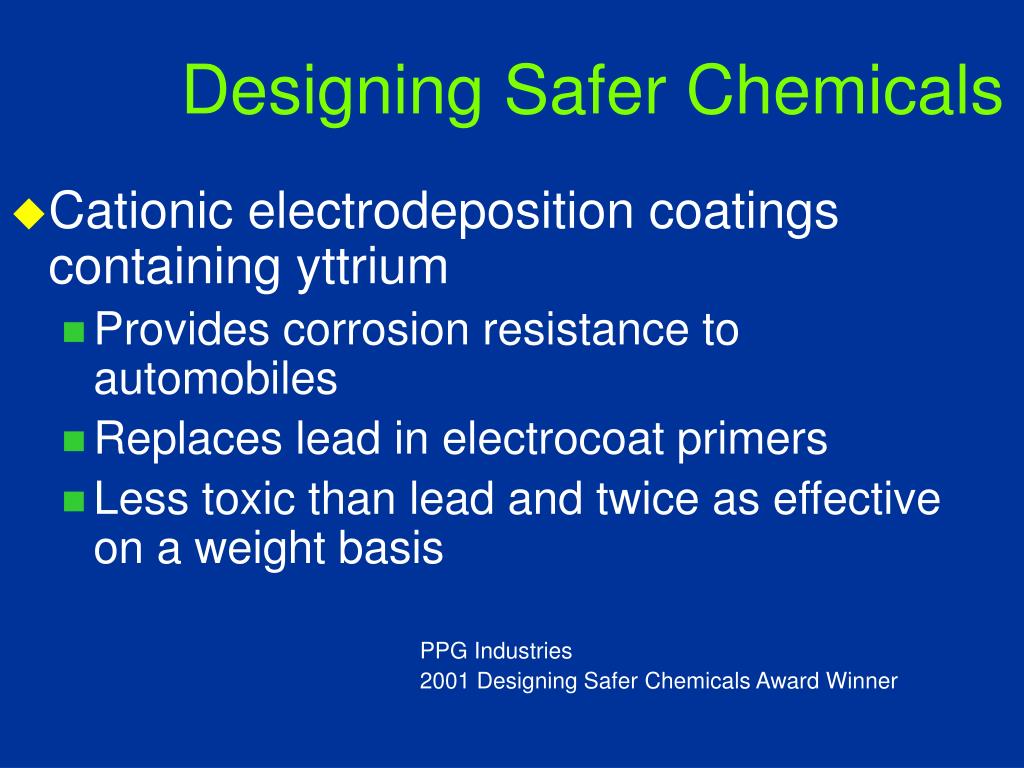 Designing Safer Chemicals • Cationic electrodeposition coatings containing yttrium • Provides corrosion resistance to automobiles • Replaces lead in electrocoat primers • Less toxic than lead and twice as effective on a weight basis PPG Industries 2001 Designing Safer Chemicals Award Winner