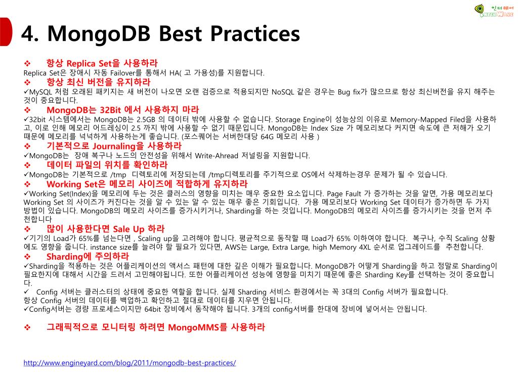 4. MongoDB Best Practices • 항상 Replica Set을 사용하라 • Replica Set은 장애시 자동 Failover를 통해서 HA( 고 가용성)를 지원합니다. • 항상 최신 버전을 유지하라 • MySQL처럼 오래된 패키지는 새 버전이 나오면 오랜 검증으로 적용되지만 NoSQL같은 경우는 Bug fix가 많으므로 항상 최신버전을 유지 해주는것이 중요합니다. • MongoDB는 32Bit 에서 사용하지 마라 • 32bit 시스템에서는 MongoDB는 2.5GB 의 데이터 밖에 사용할 수 없습니다. Storage Engine이 성능상의 이유로 Memory-Mapped Filed을 사용하고, 이로 인해 메모리 어드레싱이2.5 까지 밖에 사용할 수 없기 때문입니다. MongoDB는 Index Size 가 메모리보다 커지면 속도에 큰 저해가 오기 때문에 메모리를 넉넉하게 사용하는게 좋습니다. (포스퀘어는 서버한대당 64G 메모리 사용 ) • 기본적으로 Journaling을 사용하라 • MongoDB는 장애 복구나 노드의 안전성을 위해서 Write-Ahread저널링을 지원합니다. • 데이터 파일의 위치를 확인하라 • MongoDB는 기본적으로 /tmp디렉토리에 저장되는데 /tmp디렉토리를 주기적으로 OS에서 삭제하는경우 문제가 될 수 있습니다. • Working Set은 메모리 사이즈에 적합하게 유지하라 • Working Set(Index)을 메모리에 두는 것은 클러스의 영향을 미치는 매우 중요한 요소입니다. Page Fault 가 증가하는 것을 알면, 가용 메모리보다 Working Set 의 사이즈가 커진다는 것을 알 수 있는 알 수 있는 매우 좋은 기회입니다. 가용 메모리보다 Working Set 데이터가 증가하면 두 가지 방법이 있습니다. MongoDB의 메모리 사이즈를 증가시키거나, Sharding을 하는 것입니다. MongoDB의 메모리 사이즈를 증가시키는 것을 먼저 추천합니다 • 많이 사용한다면 Sale Up 하라 • 기기의 Load가 65%를 넘는다면 , Scaling up을 고려해야 합니다. 평균적으로 동작할 때 Load가 65% 이하여야 합니다. 복구나, 수직 Scaling 상황에도 영향을 줍니다. instance size를 늘려야 할 필요가 있다면, AWS는 Large, Extra Large, high Memory 4XL 순서로 업그레이드를 추천합니다. • Sharding에 주의하라 • Sharding을 적용하는 것은 어플리케이션의 액서스 패턴에 대한 깊은 이해가 필요합니다. MongoDB가 어떻게 Sharding을 하고 정말로 Sharding이 필요한지에 대해서 시간을 드려서 고민해야됩니다. 또한 어플리케이션 성능에 영향을 미치기 때문에 좋은 Sharding Key를 선택하는 것이 중요합니다. • Config 서버는 클러스터의 상태에 중요한 역할을 합니다. 실제 Sharding 서비스 환경에서는 꼭 3대의 Config 서버가 필요합니다. • 항상 Config 서버의 데이터를 백업하고 확인하고 절대로 데이터를 지우면 안됩니다. • Config서버는 경량 프로세스이지만 64bit 장비에서 동작해야 됩니다. 3개의 config서버를 한대에 장비에 넣어서는 안됩니다. • 그래픽적으로 모니터링 하려면 MongoMMS를 사용하라 • http://www.engineyard.com/blog/2011/mongodb-best-practices/