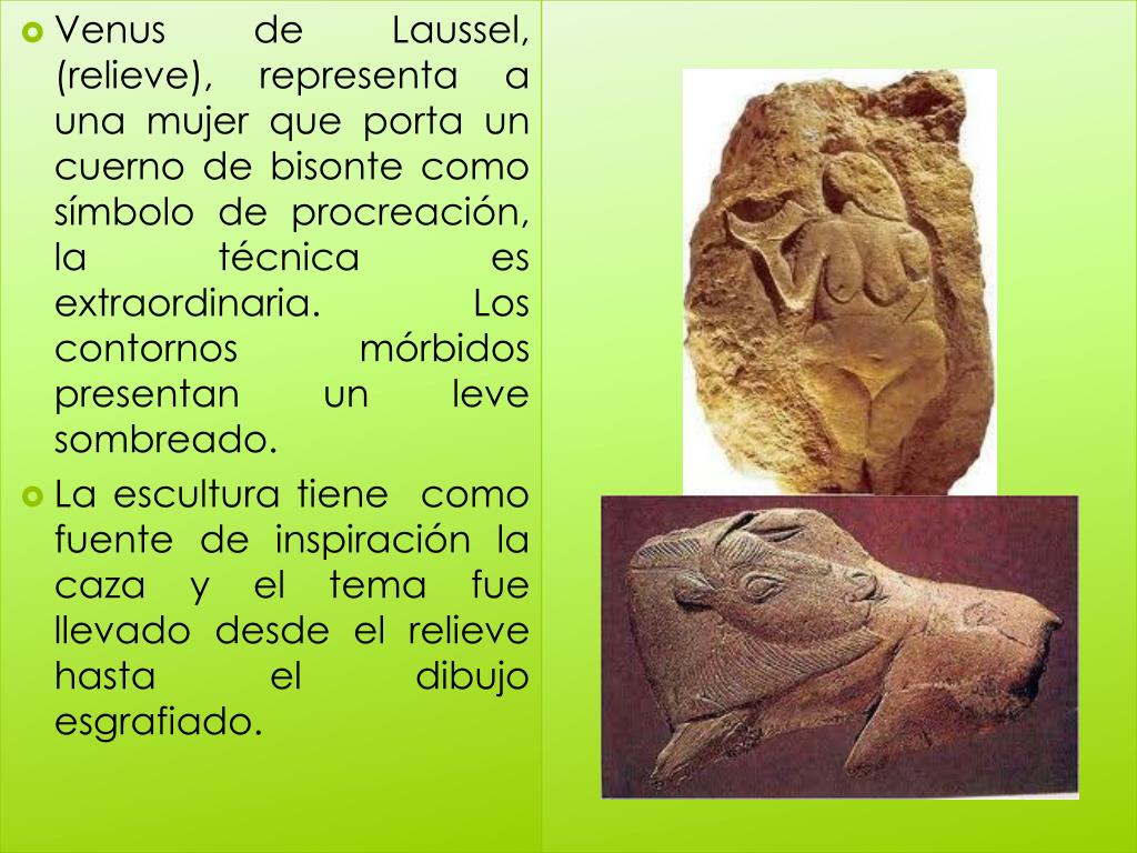 Venus de Laussel, (relieve), representa a una mujer que porta un cuerno de bisonte como símbolo de procreación, la técnica es extraordinaria. Los contornos mórbidos presentan un leve sombreado. • La escultura tiene como fuente de inspiración la caza y el tema fue llevado desde el relieve hasta el dibujo esgrafiado.