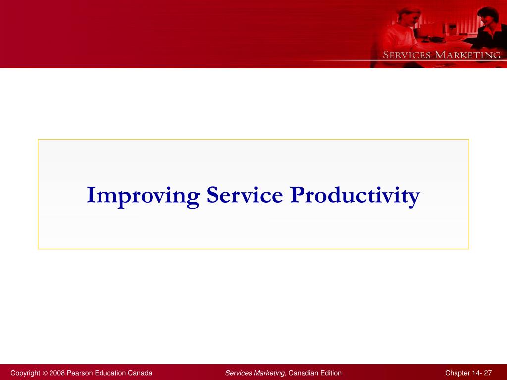 Generic Productivity Improvement Strategies • Typical strategies to improve service productivity: • Careful control of costs at every step in process • Efforts to reduce wasteful use of materials or labour • Replacing workers by automated machines • Installing expert systems that allow paraprofessionals to take on work previously performed by professionals who earn higher salaries • Although improving productivity can be approached incrementally, major gains often require redesigning entire processes