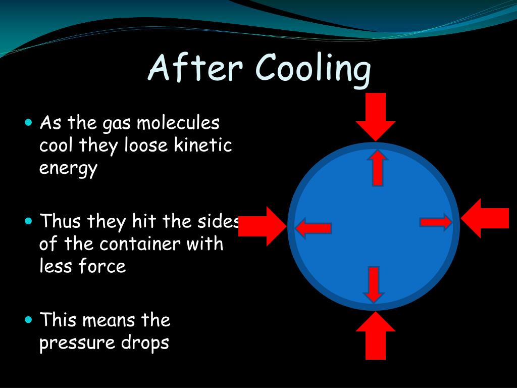 After Cooling • As the gas molecules cool they loose kinetic energy • Thus they hit the sides of the container with less force • This means the pressure drops