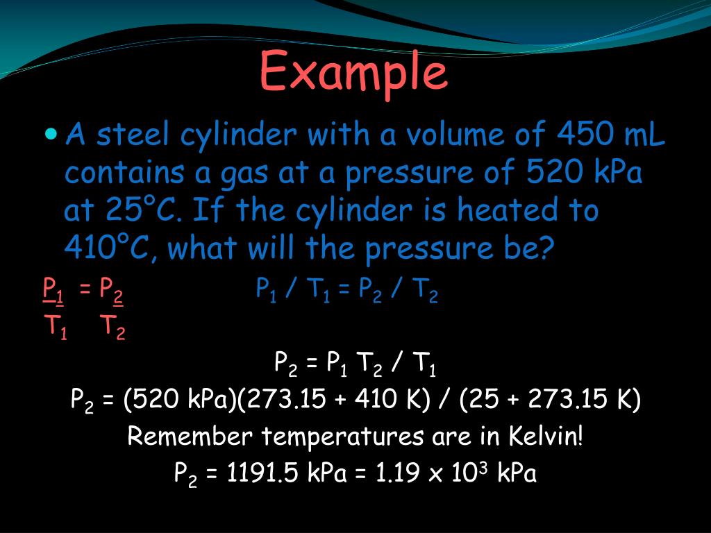 Example A steel cylinder with a volume of 450 mL contains a gas at a pressure of 520 kPa at 25°C. If the cylinder is heated to 410°C, what will the pressure be? P1 = P2P1 / T1 = P2 / T2 T1 T2 P2 = P1 T2 / T1 P2 = (520 kPa)(273.15 + 410 K) / (25 + 273.15 K) Remember temperatures are in Kelvin! P2 = 1191.5 kPa = 1.19 x 103kPa