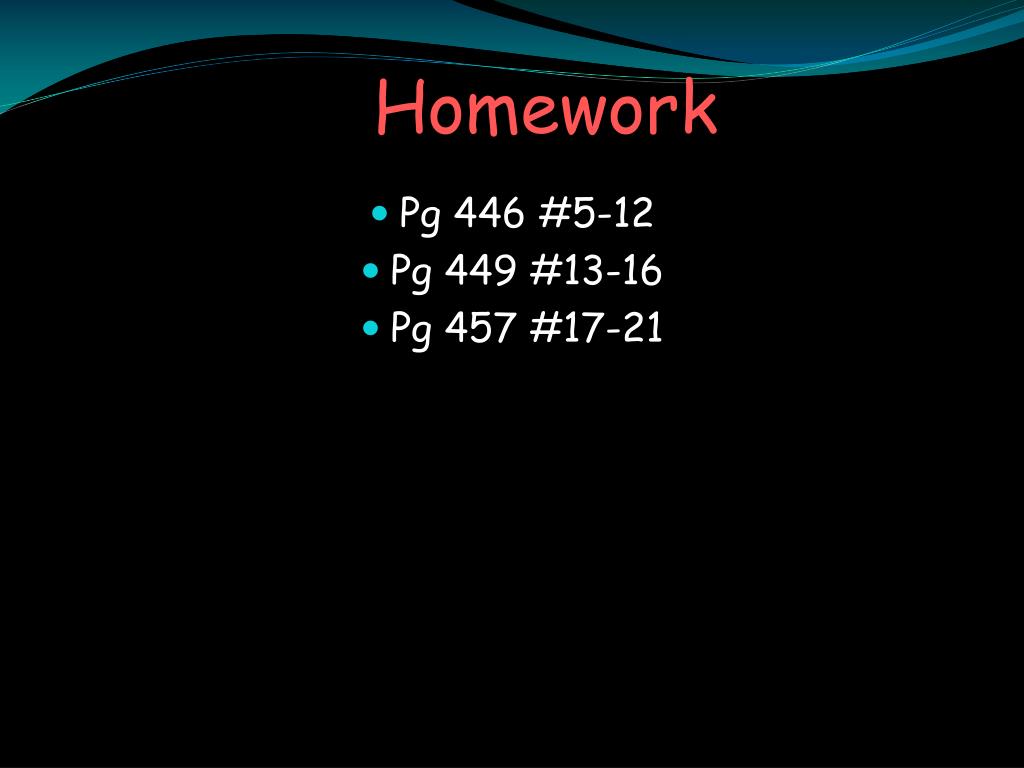 Homework • Pg 446 #5-12 • Pg 449 #13-16 • Pg 457 #17-21