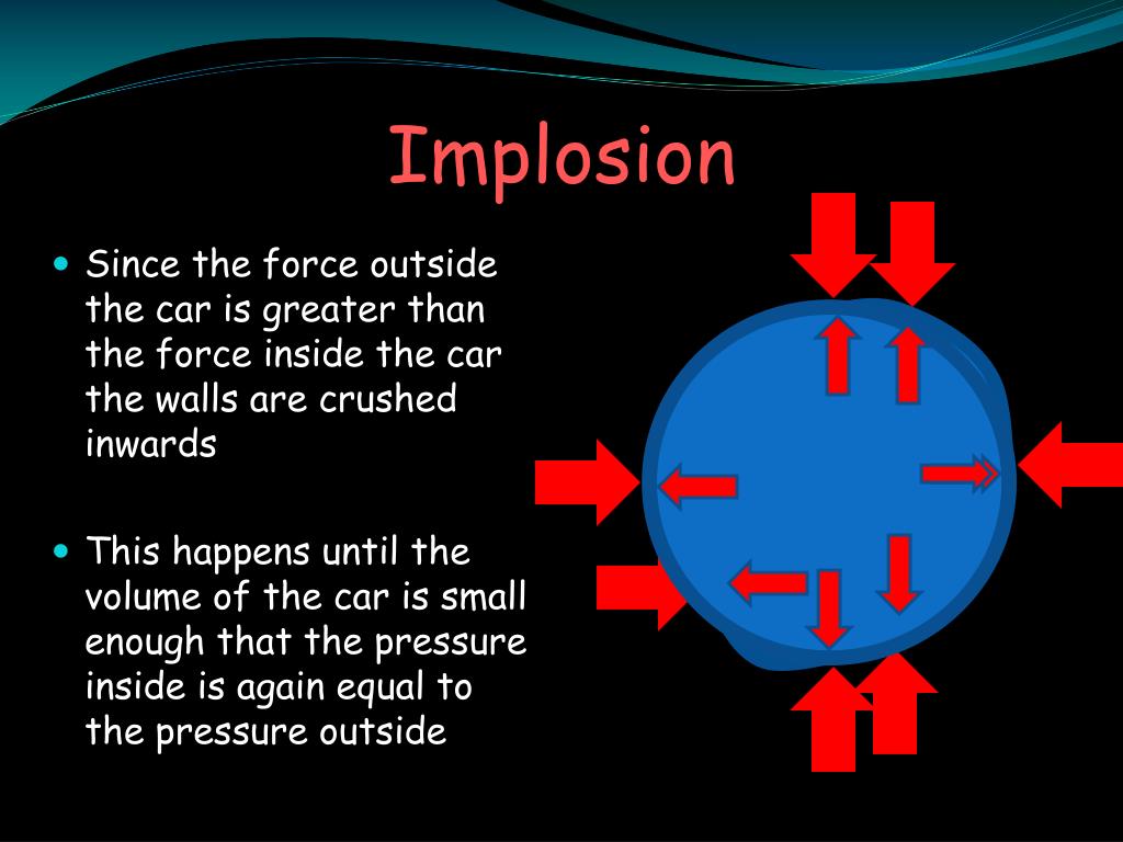 Implosion • Since the force outside the car is greater than the force inside the car the walls are crushed inwards • This happens until the volume of the car is small enough that the pressure inside is again equal to the pressure outside