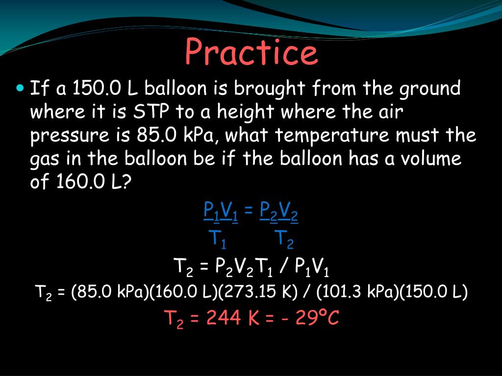 Practice • If a 150.0 L balloon is brought from the ground where it is STP to a height where the air pressure is 85.0 kPa, what temperature must the gas in the balloon be if the balloon has a volume of 160.0 L? P1V1 = P2V2 T1 T2 T2 = P2V2T1 / P1V1 T2 = (85.0 kPa)(160.0 L)(273.15 K) / (101.3 kPa)(150.0 L) T2 = 244 K = - 29ºC
