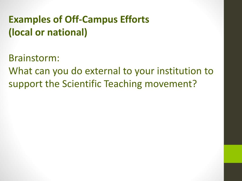 Examples of Off-Campus Efforts (local or national) Brainstorm: What can you do external to your institution to support the Scientific Teaching movement?