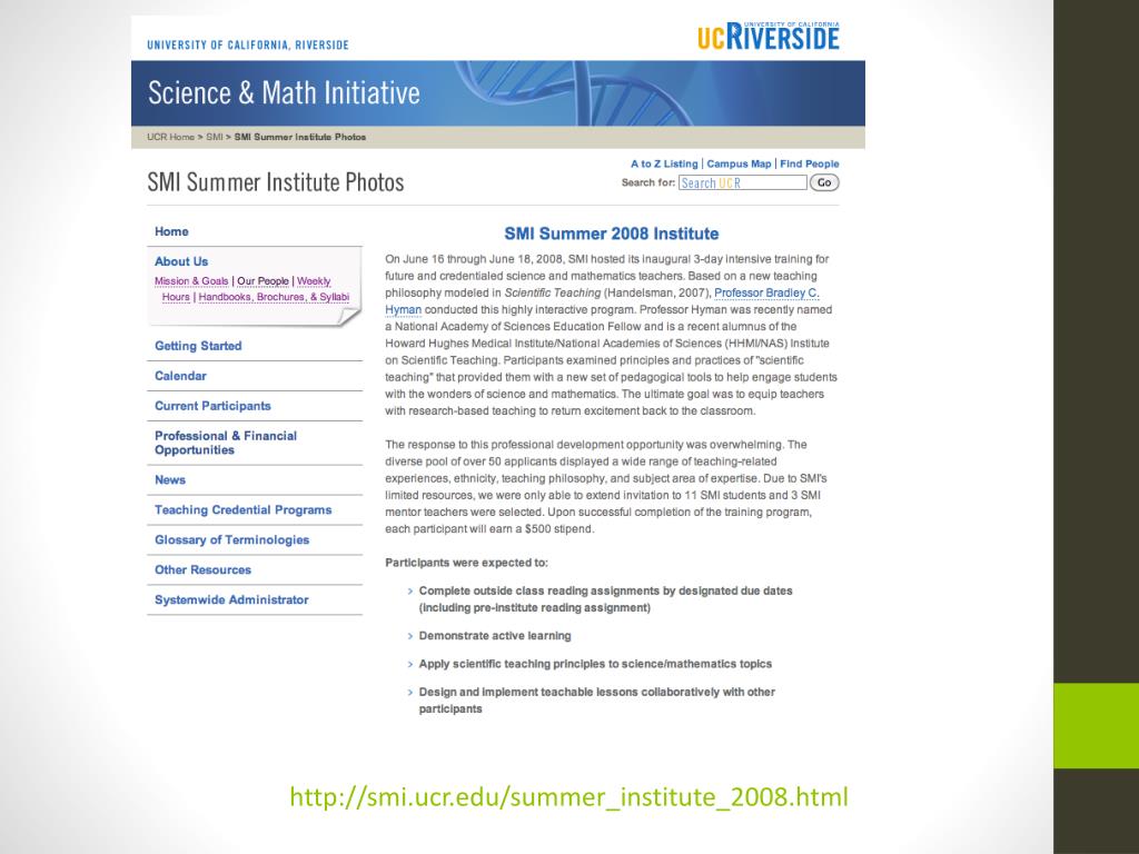 Participants: • Mixture of in-service middle and high school (grades 7-12) mathematics and science teachers; previous service as SMI mentor teachers and pre-service mathematics and sciences majors (engineering too, but difficult).
