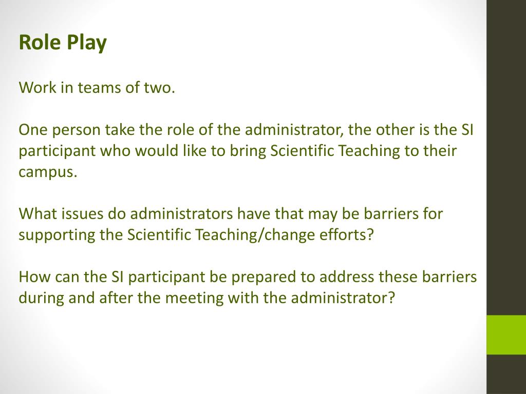 Role Play Work in teams of two. One person take the role of the administrator, the other is the SI participant who would like to bring Scientific Teaching to their campus. What issues do administrators have that may be barriers for supporting the Scientific Teaching/change efforts? How can the SI participant be prepared to address these barriers during and after the meeting with the administrator?
