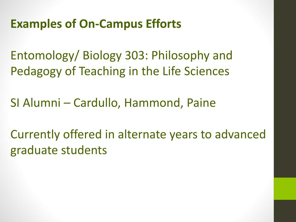 Examples of On-Campus Efforts Entomology/ Biology 303: Philosophy and Pedagogy of Teaching in the Life Sciences SI Alumni – Cardullo, Hammond, Paine Currently offered in alternate years to advanced graduate students
