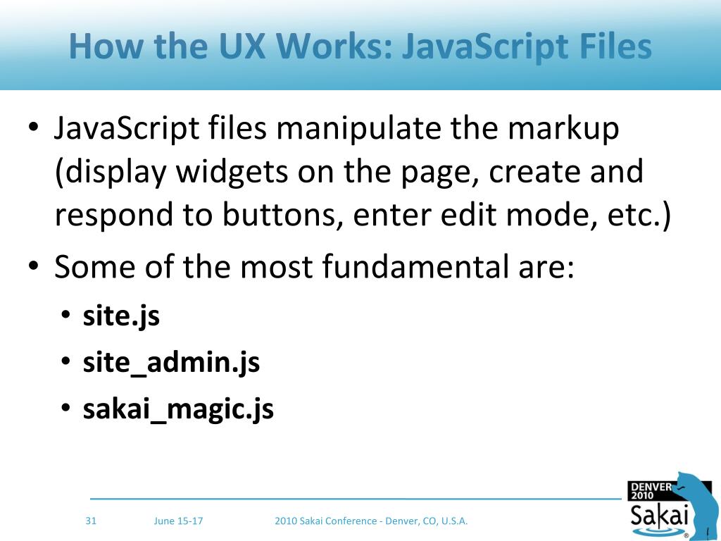 How the UX Works: JavaScript Files • JavaScript files manipulate the markup (display widgets on the page, create and respond to buttons, enter edit mode, etc.) • Some of the most fundamental are: • site.js • site_admin.js • sakai_magic.js June 15-17 2010 Sakai Conference - Denver, CO, U.S.A.