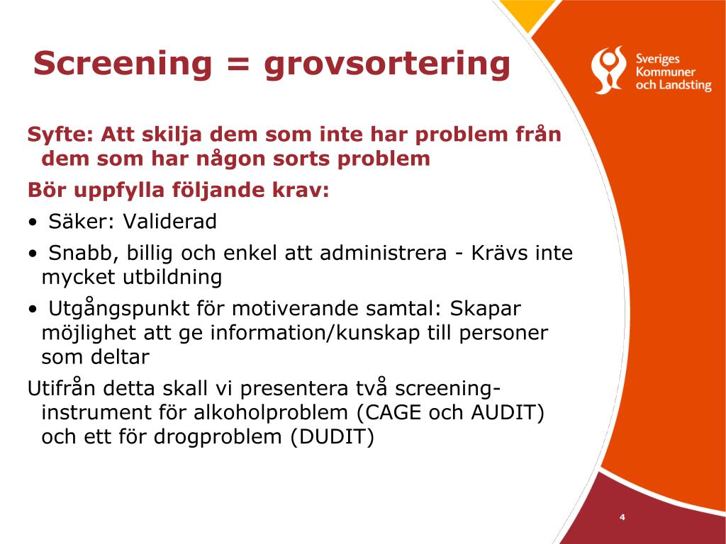 Screening = grovsortering Syfte: Att skilja dem som inte har problem från dem som har någon sorts problem Bör uppfylla följande krav: • Säker: Validerad • Snabb, billig och enkel att administrera - Krävs inte mycket utbildning • Utgångspunkt för motiverande samtal: Skapar möjlighet att ge information/kunskap till personer som deltar Utifrån detta skall vi presentera två screening-instrument för alkoholproblem (CAGE och AUDIT) och ett för drogproblem (DUDIT)