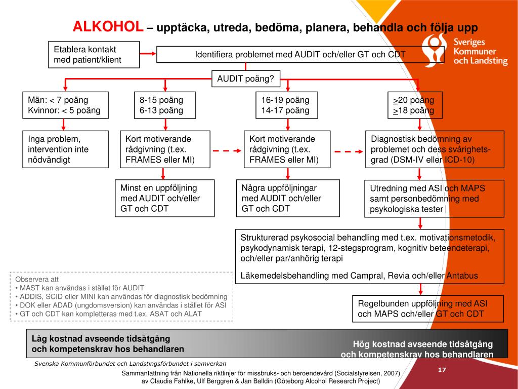 ALKOHOL– upptäcka, utreda, bedöma, planera, behandla och följa upp Etablera kontakt med patient/klient Identifiera problemet med AUDIT och/eller GT och CDT AUDIT poäng? Män: < 7 poäng Kvinnor: < 5 poäng 8-15 poäng 6-13 poäng 16-19 poäng 14-17 poäng >20 poäng >18 poäng Inga problem, intervention inte nödvändigt Kort motiverande rådgivning (t.ex. FRAMES eller MI) Kort motiverande rådgivning (t.ex. FRAMES eller MI) Diagnostisk bedömning av problemet och dess svårighets-grad (DSM-IV eller ICD-10) Minst en uppföljning med AUDIT och/eller GT och CDT Några uppföljningar med AUDIT och/eller GT och CDT Utredning med ASI och MAPS samt personbedömning med psykologiska tester Strukturerad psykosocial behandling med t.ex. motivationsmetodik, psykodynamisk terapi, 12-stegsprogram, kognitiv beteendeterapi, och/eller par/anhörig terapi Läkemedelsbehandling med Campral, Revia och/eller Antabus • Observera att • MAST kan användas i stället för AUDIT • ADDIS, SCID eller MINI kan användas för diagnostisk bedömning • DOK eller ADAD (ungdomsversion) kan användas i stället för ASI • GT och CDT kan kompletteras med t.ex. ASAT och ALAT Regelbunden uppföljning med ASI och MAPS och/eller GT och CDT Låg kostnad avseende tidsåtgång och kompetenskrav hos behandlaren Hög kostnad avseende tidsåtgång och kompetenskrav hos behandlaren Sammanfattning från Nationella riktlinjer för missbruks- och beroendevård (Socialstyrelsen, 2007) av Claudia Fahlke, Ulf Berggren & Jan Balldin (Göteborg Alcohol Research Project)