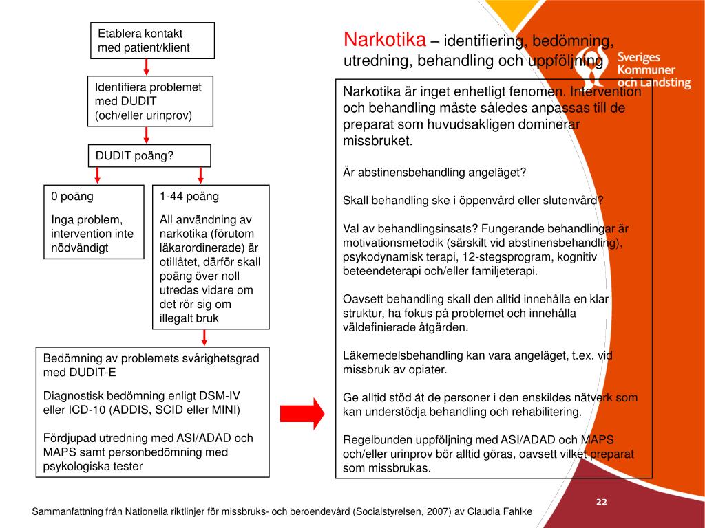 Etablera kontakt med patient/klient Narkotika– identifiering, bedömning, utredning, behandling och uppföljning Identifiera problemet med DUDIT (och/eller urinprov) Narkotika är inget enhetligt fenomen. Intervention och behandling måste således anpassas till de preparat som huvudsakligen dominerar missbruket. Är abstinensbehandling angeläget? Skall behandling ske i öppenvård eller slutenvård? Val av behandlingsinsats? Fungerande behandlingar är motivationsmetodik (särskilt vid abstinensbehandling), psykodynamisk terapi, 12-stegsprogram, kognitiv beteendeterapi och/eller familjeterapi. Oavsett behandling skall den alltid innehålla en klar struktur, ha fokus på problemet och innehålla väldefinierade åtgärden. Läkemedelsbehandling kan vara angeläget, t.ex. vid missbruk av opiater. Ge alltid stöd åt de personer i den enskildes nätverk som kan understödja behandling och rehabilitering. Regelbunden uppföljning med ASI/ADAD och MAPS och/eller urinprov bör alltid göras, oavsett vilket preparat som missbrukas. DUDIT poäng? 0 poäng Inga problem, intervention inte nödvändigt 1-44 poäng All användning av narkotika (förutom läkarordinerade) är otillåtet, därför skall poäng över noll utredas vidare om det rör sig om illegalt bruk Bedömning av problemets svårighetsgrad med DUDIT-E Diagnostisk bedömning enligt DSM-IV eller ICD-10 (ADDIS, SCID eller MINI) Fördjupad utredning med ASI/ADAD och MAPS samt personbedömning med psykologiska tester Sammanfattning från Nationella riktlinjer för missbruks- och beroendevård (Socialstyrelsen, 2007) av Claudia Fahlke