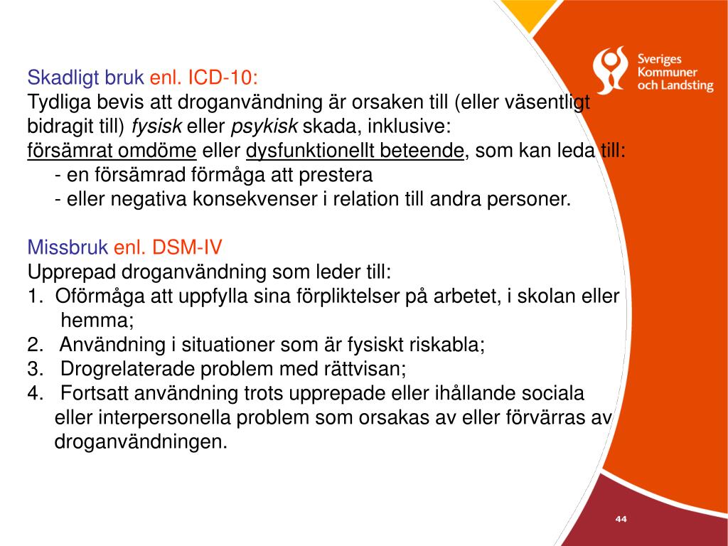 Beroende enl. ICD-10Minst tre uppfyllda inom samma tolvmånaders period 1. En stark önskan eller en känsla av tvång att ta drogen; 2. Svårigheter att kontrollera användning, tidpunkten, mängden eller att sluta; • Abstinensbesvär • Toleransökning eller minskad tolerans • Givit upp/begränsat viktiga sociala/yrkesmässiga aktiviteter/ fritidsintressen pga drogen eller avsevärd tid går åt till att skaffa, inta eller återhämta sig från drogen 6. Fortsatt droganvändning trots klara bevis på skadliga konsekvenser om vilka personen är eller bör kunna förväntas vara medveten.
