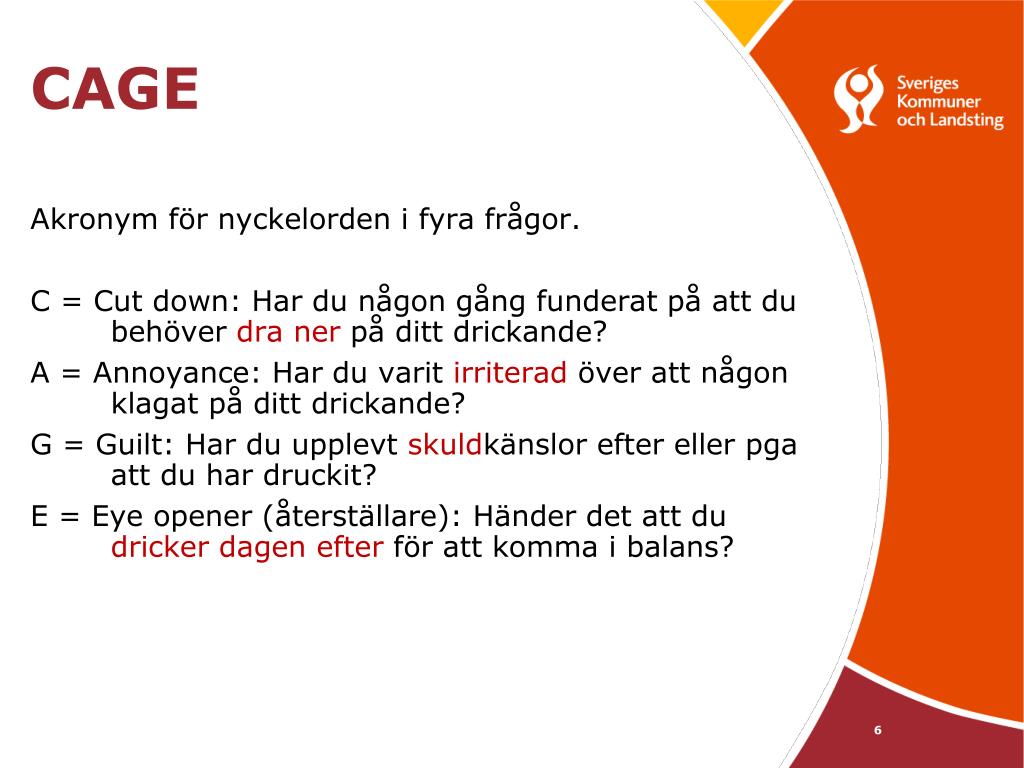 CAGE Akronym för nyckelorden i fyra frågor. C = Cutdown: Har du någon gång funderat på att du behöver dra ner på ditt drickande? A = Annoyance: Har du varit irriterad över att någon klagat på ditt drickande? G = Guilt: Har du upplevt skuldkänslor efter eller pga att du har druckit? E = Eye opener (återställare): Händer det att du dricker dagen efter för att komma i balans?