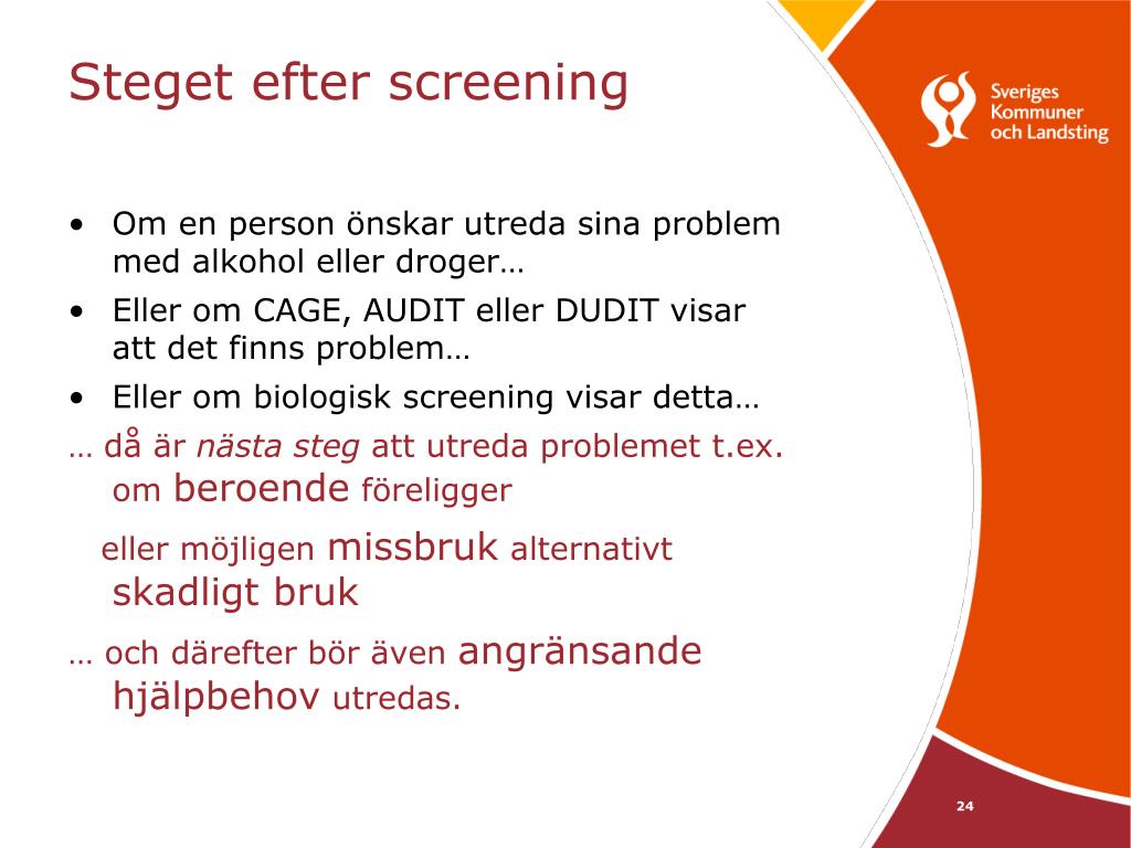 Steget efter screening • Om en person önskar utreda sina problem med alkohol eller droger… • Eller om CAGE, AUDIT eller DUDIT visar att det finns problem… • Eller om biologisk screening visar detta… …då är nästa steg att utreda problemet t.ex. om beroende föreligger eller möjligen missbruk alternativt skadligt bruk … och därefter bör även angränsande hjälpbehov utredas.
