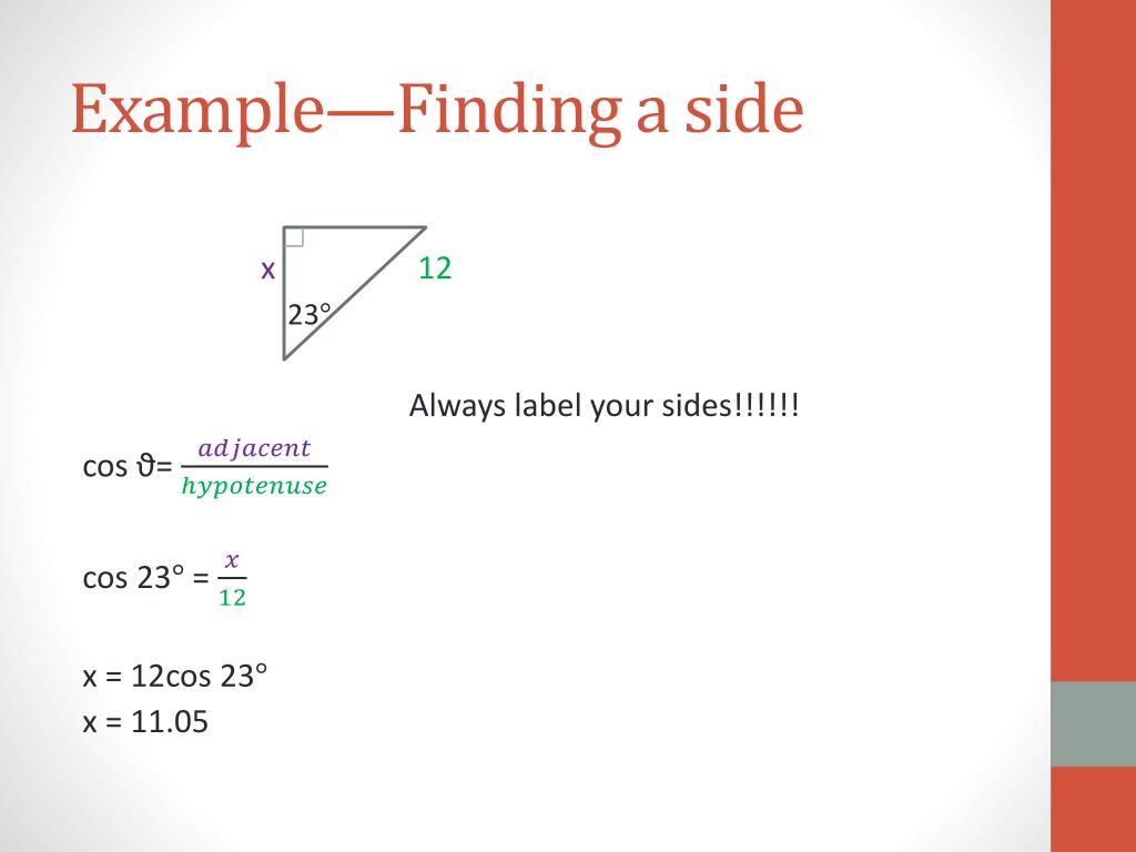 Example—Finding a side x12 23 Always label your sides!!!!!! cosϑ= cos 23 = x = 12cos 23 x = 11.05