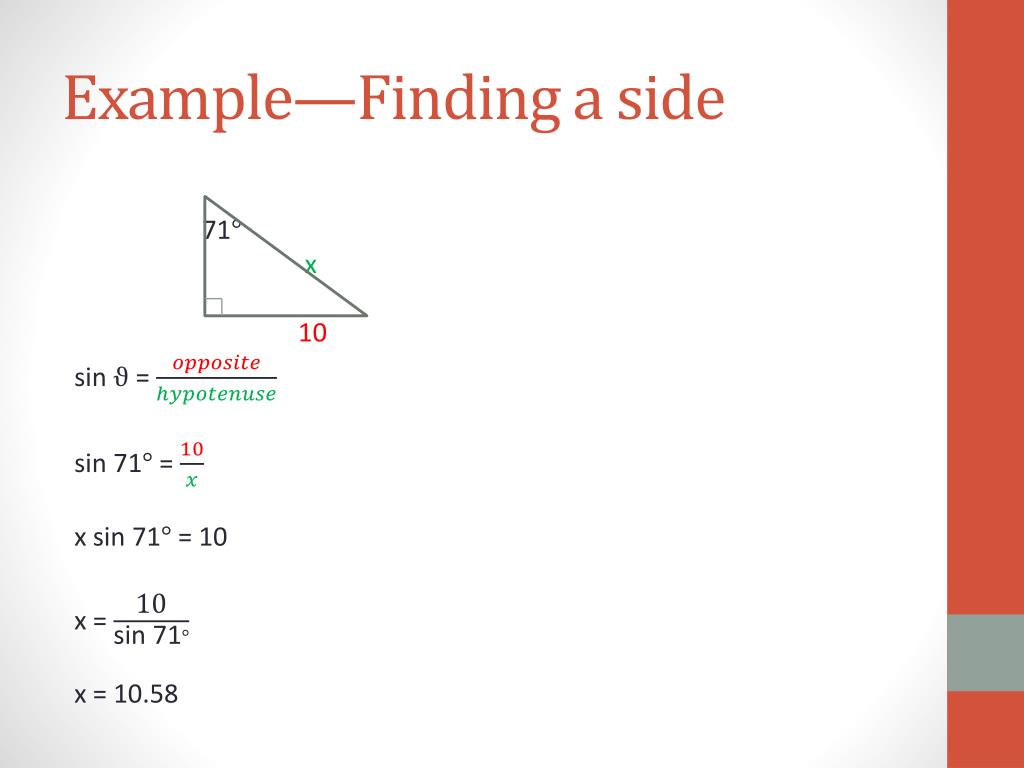 Example—Finding a side 71 x 10 sin = sin 71= x sin 71 = 10 x = x = 10.58