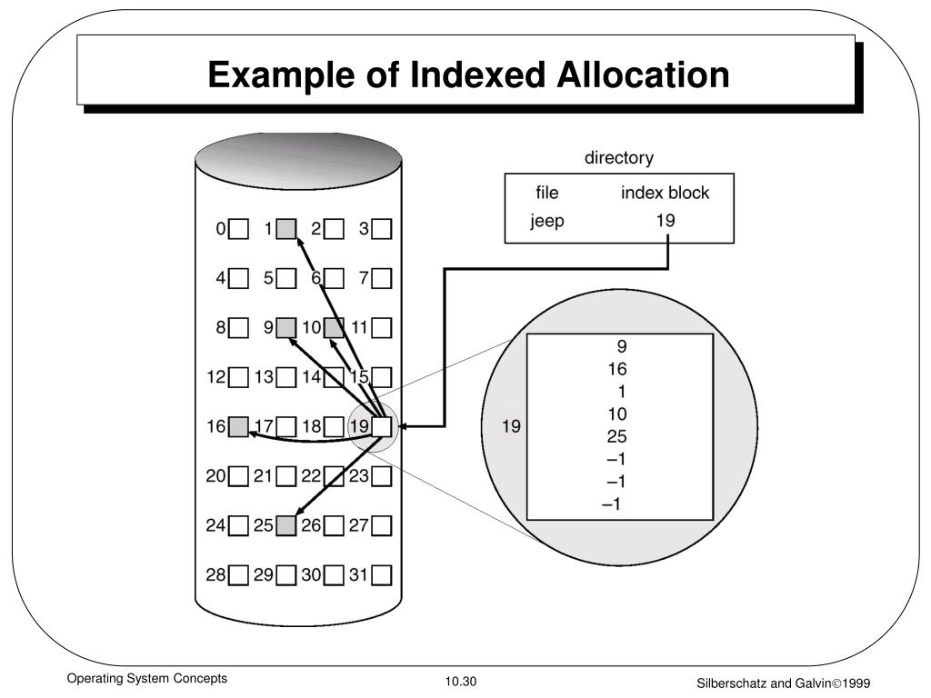 Indexed Allocation (Cont.) • Need index table • Random access • Dynamic access without external fragmentation, but have overhead of index block. Operating System Concepts
