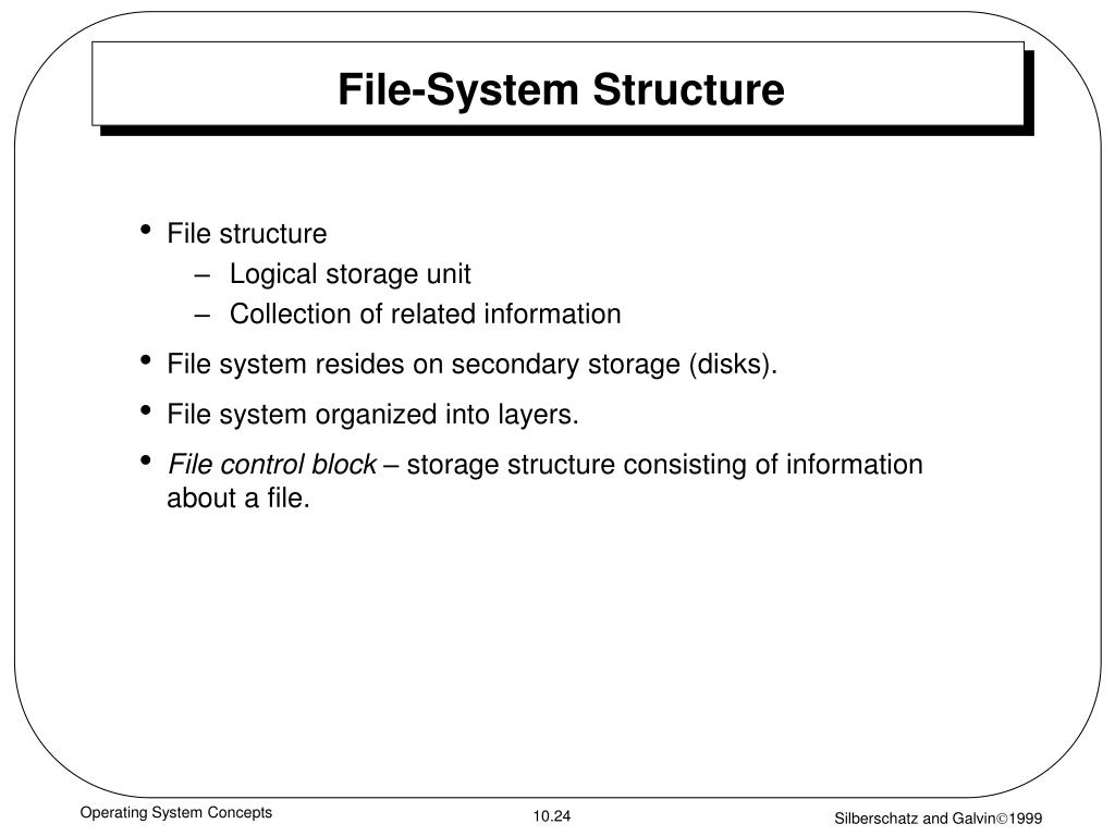 File-System Structure • File structure • Logical storage unit • Collection of related information • File system resides on secondary storage (disks). • File system organized into layers. • File control block – storage structure consisting of information about a file. Operating System Concepts