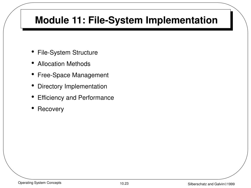 Module 11: File-System Implementation • File-System Structure • Allocation Methods • Free-Space Management • Directory Implementation • Efficiency and Performance • Recovery Operating System Concepts