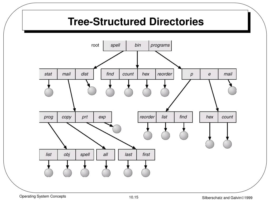 Tree-Structured Directories (Cont.) • Efficient searching • Grouping Capability • Current directory (working directory) • cd /spell/mail/prog • type list Operating System Concepts