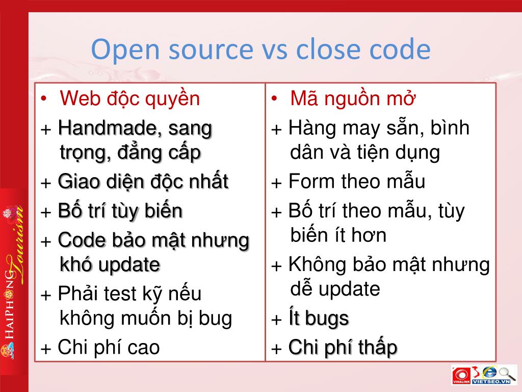 Open source vs close code • Web độcquyền + Handmade, sang trọng, đẳngcấp + Giaodiệnđộcnhất + Bốtrítùybiến + Code bảomậtnhưngkhó update + Phải test kỹnếukhôngmuốnbị bug + Chi phícao • Mãnguồnmở + Hàng may sẵn, bìnhdânvàtiệndụng + Form theomẫu + Bốtrítheomẫu, tùybiếníthơn + Khôngbảomậtnhưngdễ update + Ít bugs + Chi phíthấp