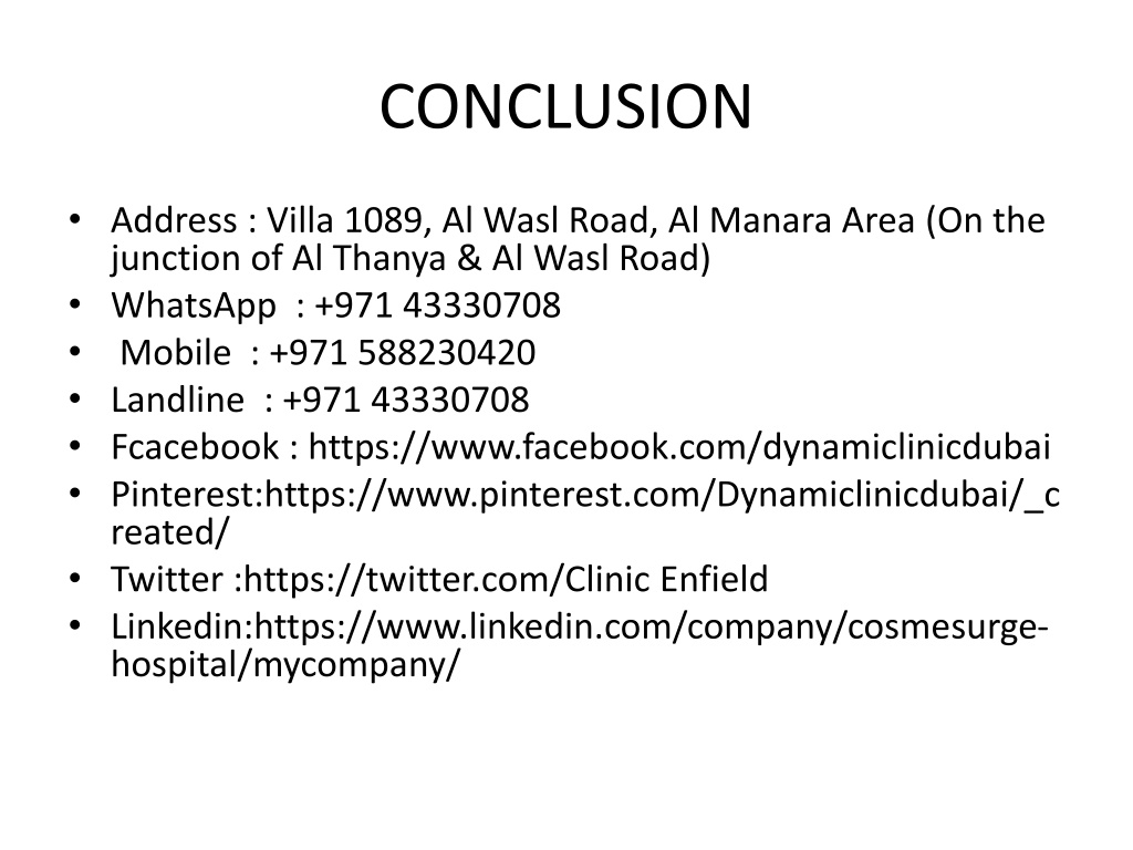 CONCLUSION • Address : Villa 1089, Al Wasl Road, Al Manara Area (On the junction of Al Thanya & Al Wasl Road) • WhatsApp : +971 43330708 • Mobile : +971 588230420 • Landline : +971 43330708 • Fcacebook : https://www.facebook.com/dynamiclinicdubai • Pinterest:https://www.pinterest.com/Dynamiclinicdubai/_created/ • Twitter :https://twitter.com/Clinic Enfield • Linkedin:https://www.linkedin.com/company/cosmesurge-hospital/mycompany/