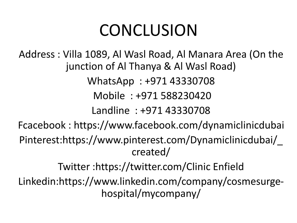 CONCLUSION Address : Villa 1089, Al Wasl Road, Al Manara Area (On the junction of Al Thanya & Al Wasl Road) WhatsApp : +971 43330708 Mobile : +971 588230420 Landline : +971 43330708 Fcacebook : https://www.facebook.com/dynamiclinicdubai Pinterest:https://www.pinterest.com/Dynamiclinicdubai/_created/ Twitter :https://twitter.com/Clinic Enfield Linkedin:https://www.linkedin.com/company/cosmesurge-hospital/mycompany/