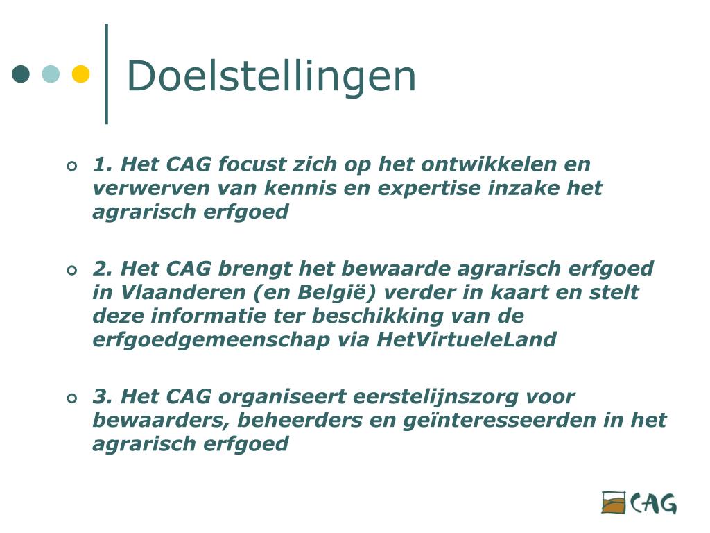 Doelstellingen • 1. Het CAG focust zich op het ontwikkelen en verwerven van kennis en expertise inzake het agrarisch erfgoed • 2. Het CAG brengt het bewaarde agrarisch erfgoed in Vlaanderen (en België) verder in kaart en stelt deze informatie ter beschikking van de erfgoedgemeenschap via HetVirtueleLand • 3. Het CAG organiseert eerstelijnszorg voor bewaarders, beheerders en geïnteresseerden in het agrarisch erfgoed