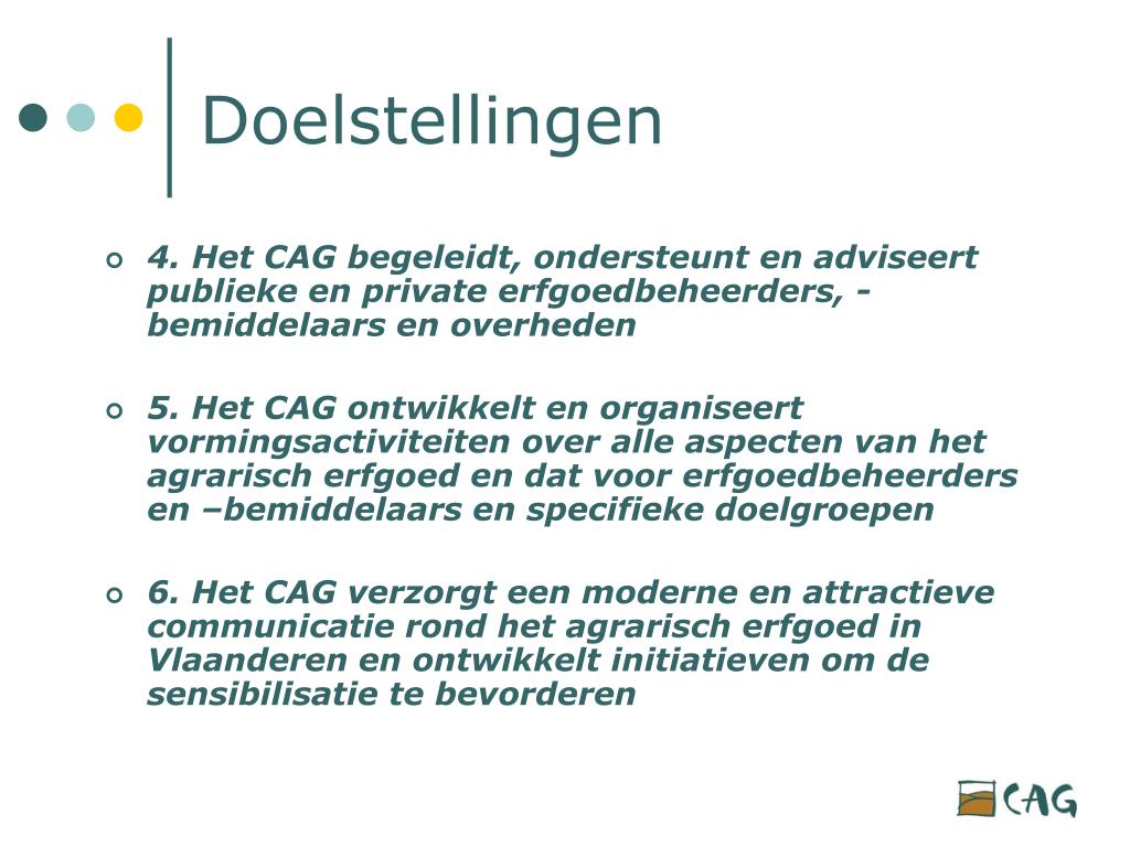 Doelstellingen • 4. Het CAG begeleidt, ondersteunt en adviseert publieke en private erfgoedbeheerders, -bemiddelaars en overheden • 5. Het CAG ontwikkelt en organiseert vormingsactiviteiten over alle aspecten van het agrarisch erfgoed en dat voor erfgoedbeheerders en –bemiddelaars en specifieke doelgroepen • 6. Het CAG verzorgt een moderne en attractieve communicatie rond het agrarisch erfgoed in Vlaanderen en ontwikkelt initiatieven om de sensibilisatie te bevorderen
