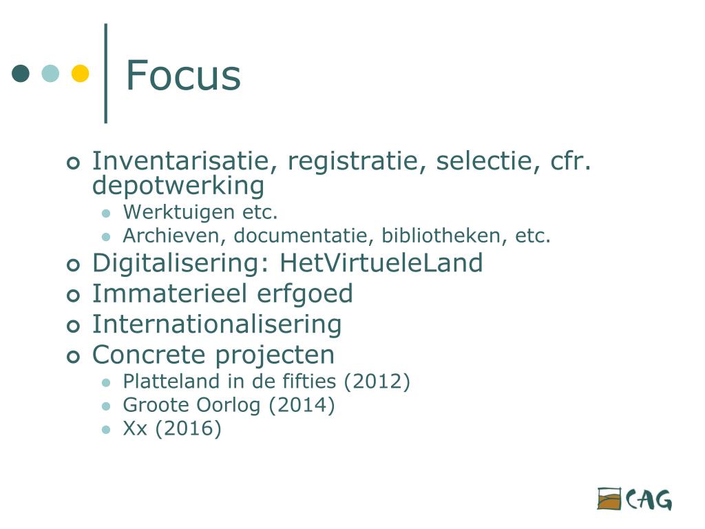 Focus • Inventarisatie, registratie, selectie, cfr. depotwerking • Werktuigen etc. • Archieven, documentatie, bibliotheken, etc. • Digitalisering: HetVirtueleLand • Immaterieel erfgoed • Internationalisering • Concrete projecten • Platteland in de fifties (2012) • Groote Oorlog (2014) • Xx (2016)