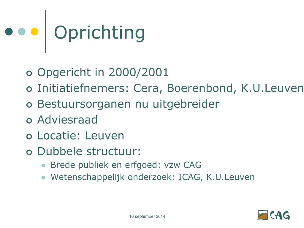 Oprichting • Opgericht in 2000/2001 • Initiatiefnemers: Cera, Boerenbond, K.U.Leuven • Bestuursorganen nu uitgebreider • Adviesraad • Locatie: Leuven • Dubbele structuur: • Brede publiek en erfgoed: vzw CAG • Wetenschappelijk onderzoek: ICAG, K.U.Leuven