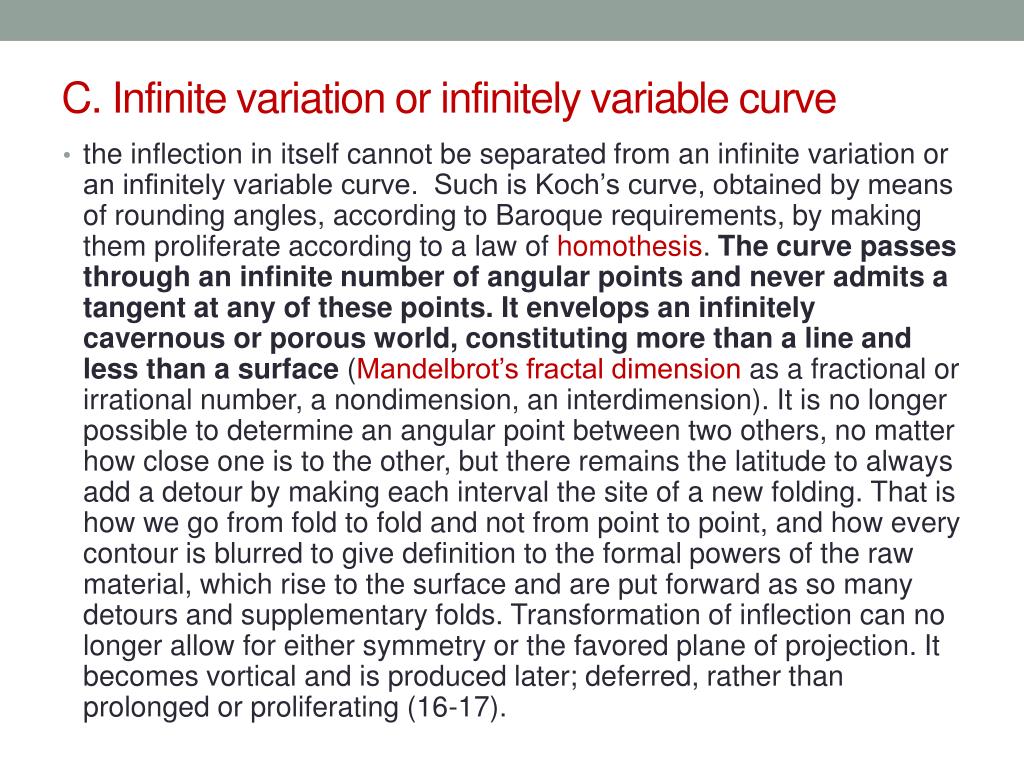 C. Infinite variation or infinitely variable curve • the inflection in itself cannot be separated from an infinite variation or an infinitely variable curve. Such is Koch’s curve, obtained by means of rounding angles, according to Baroque requirements, by making them proliferate according to a law of homothesis. The curve passes through an infinite number of angular points and never admits a tangent at any of these points. It envelops an infinitely cavernous or porous world, constituting more than a line and less than a surface (Mandelbrot’s fractal dimension as a fractional or irrational number, a nondimension, an interdimension). It is no longer possible to determine an angular point between two others, no matter how close one is to the other, but there remains the latitude to always add a detour by making each interval the site of a new folding. That is how we go from fold to fold and not from point to point, and how every contour is blurred to give definition to the formal powers of the raw material, which rise to the surface and are put forward as so many detours and supplementary folds. Transformation of inflection can no longer allow for either symmetry or the favored plane of projection. It becomes vortical and is produced later; deferred, rather than prolonged or proliferating (16-17).