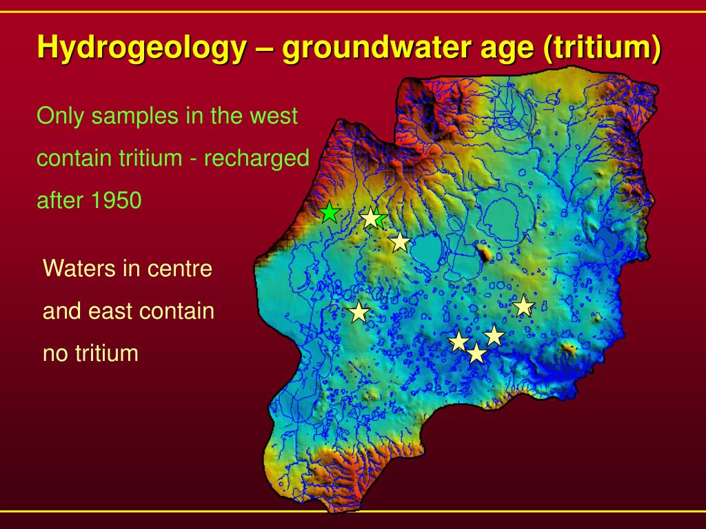 Hydrogeology – groundwater age (tritium) Only samples in the west contain tritium - recharged after 1950 Waters in centre and east contain no tritium