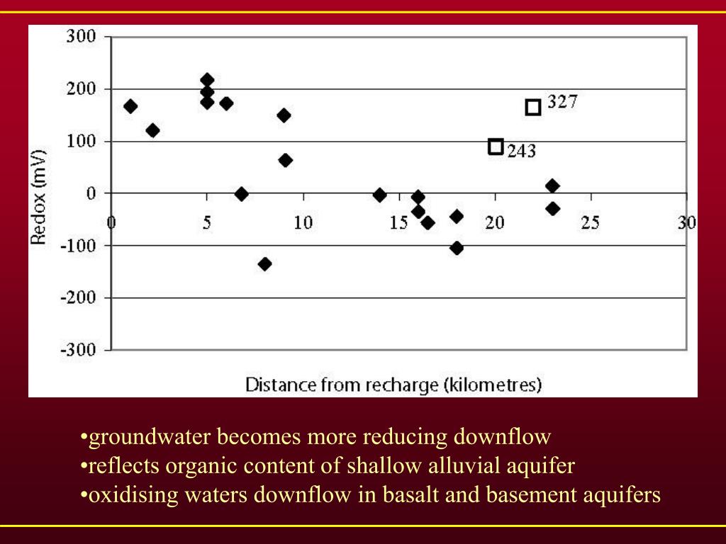 groundwater becomes more reducing downflow • reflects organic content of shallow alluvial aquifer • oxidising waters downflow in basalt and basement aquifers