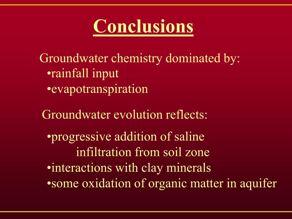Conclusions Groundwater chemistry dominated by: • rainfall input • evapotranspiration Groundwater evolution reflects: • progressive addition of saline • infiltration from soil zone • interactions with clay minerals • some oxidation of organic matter in aquifer