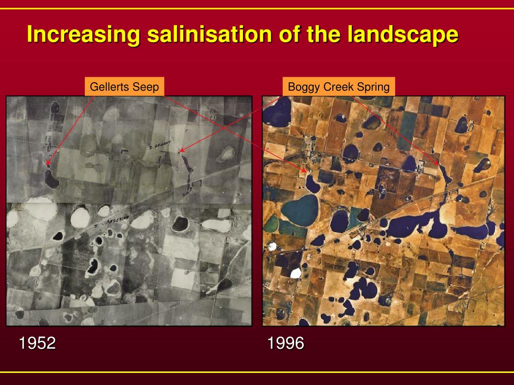 Increasing salinisation of the landscape Gellerts Seep Boggy Creek Spring 1952 1996