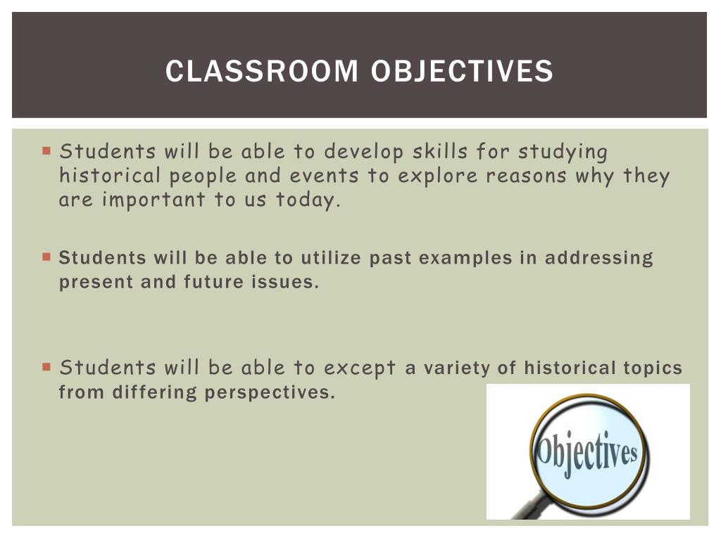 Classroom Objectives • Students will be able to develop skills for studying historical people and events to explore reasons why they are important to us today. • Students will be able to utilize past examples in addressing present and future issues. • Students will be able to except avariety of historical topics from differing perspectives.