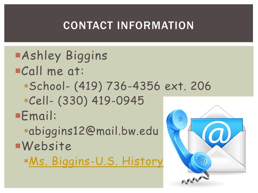 Contact Information • Ashley Biggins • Call me at: • School- (419) 736-4356 ext. 206 • Cell- (330) 419-0945 • Email: • abiggins12@mail.bw.edu • Website • Ms. Biggins-U.S. History