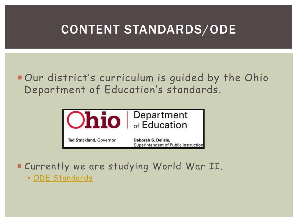 Content Standards/ODE • Our district’s curriculum is guided by the Ohio Department of Education’s standards. • Currently we are studying World War II. • ODE Standards
