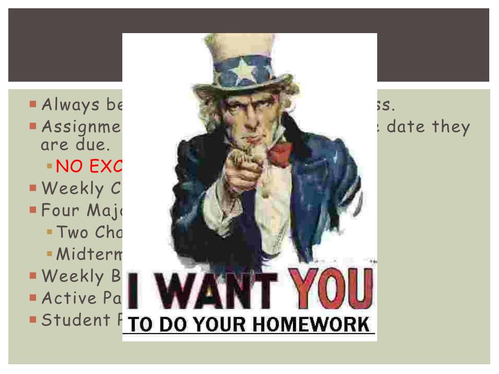 Course Expectations • Always be prepared and on time to class. • Assignments must be completed by the date they are due. • NO EXCEPTIONS! • Weekly Current Event Quizzes • Four Major Assessments • Two Chapter Tests • Midterm/Final • Weekly Blog Entries • Active Participation during lessons • Student Project